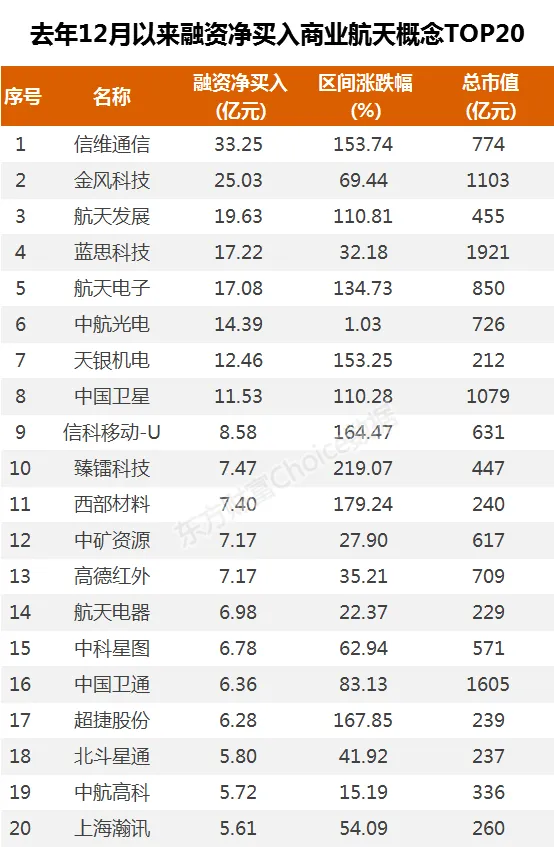 东方财富Choice数据显示,自去年12月至今的两个月,杠杆资金净买入了一批商业航天概念股。具体来看,信维通信排名第一,融资净买入超33亿元;金风科技排名第二,融资净买入超25亿元。