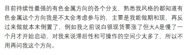 上图是上周三复盘刚好说到有色方向的分析,周四晚上开始就急剧调整,周五晚上更是史诗级别的空头行情。A在跟涨这方面滞后,但在跟跌这个方面是从不会缺席的,逃顶是非常非常难的事情,特别在T+1的市场。