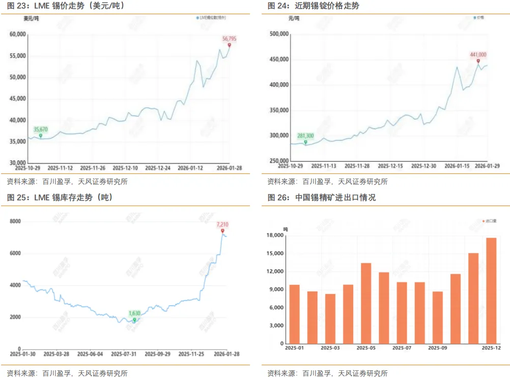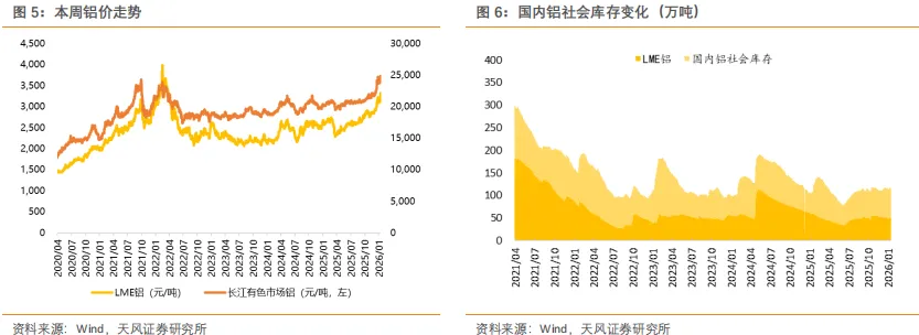 1)铜:本周铜价重心大幅上移后回落,沪铜收于103190元/吨。周内走势表现冲高回落,周四晚(1.29)再创历史新高,且临近月底,下游企业采购需求难有明显提升空间,日内谨慎观望情绪较强,同时部分持货商周初回款换现需求显现,现货贴水幅度有所扩大,但考虑到近月合约Contango结构高位运行,部分贸易商逢低日内大贴水收货动作仍存,现货升贴水后续有所收敛;库存方面,由于部分仓库到货入库量表现缩减,社库整体表现下降。下周来看,随着铜价冲高,进口窗口部分时间表现打开,周内进口货源预计有所清关流入补充,但考虑到铜价高位,且月初加工企业陆续进入停产放假阶段,下游需求难有提升空间,现货升贴水回升空间同样有限,整体预计区间运行于贴200~贴50元/吨。相关标的:紫金矿业、五矿资源、洛阳钼业、金诚信、中国有色矿业(H)、铜陵有色、江西铜业(A+H)。2)铝:本周铝价上涨,沪铝收于24600元/吨。供应方面:本周电解铝行业暂无减产、复产出现,少量新投产产能继续释放,行业整体开工产能小增。需求方面:本周铝棒产量较上周略增加,铝棒企业增减产互现,铝板产量较上周减少,主要是河南部分板带企业因环保管控较为严格而降负荷运行,产能利用率较上周继续回落。铝锭成交方面,现货铝价跌后再次上涨,市场整体成交贴水扩大且较为一般。成本方面:氧化铝方面,中国国产氧化铝价格继续小幅下跌,本周中国国产氧化铝均价为2633.89元/吨,较上周均价下跌6.95元/吨,跌幅为0.26%,预计本周电解铝理论成本微幅减少。利润方面:预计本周电解铝理论成本微减,同时现货铝均价大幅上涨,预计本周电解铝理论利润较上周再次增加。库存方面:本周LME铝库存较上周增加,目前LME铝库存50万吨,较上周50.72万吨减少0.72万吨。中国方面,本周铝锭社会库存持续累库,目前库存79.91万吨,较上周76.43万吨增加3.48万吨。相关标的:云铝股份、神火股份、南山铝业、天山铝业、中孚实业、中国宏桥、宏创控股、中国铝业(A+H)、创新实业、焦作万方、华通电缆、百通能源等。