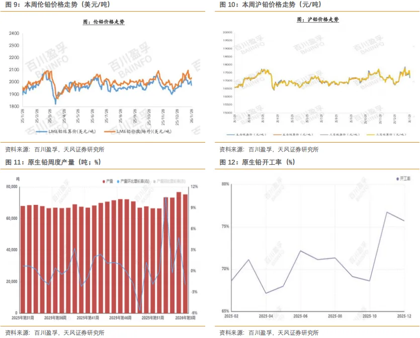 综述:本周(2026.1.23-2026.1.29)铅价弱势运行,整体均价有所下跌。截至本周三(1月28日),LmeS_铅3M一周结算均价1987美元/吨,较上周均价下跌21美元/吨,跌幅为1.06%。截至本周四(1月29日),沪铅主力一周结算均价17058元/吨,较上周均价下跌194元/吨,跌幅为1.12%。百川盈孚1#铅锭指导价一周均价16870元/吨,较上周均价下跌175元/吨,跌幅为1.03%。宏观面,美国联邦储备委员会28日结束为期两天的货币政策会议,宣布将联邦基金利率目标区间维持在3.5%至3.75%之间不变。基本面,供应端,部分再生铅企受制于环保管控及原料成本高企利润亏损,减停产现象多发,供应收缩。需求端,下游企业虽有节前备货,但不及预期表现,但整体需求清淡,市场现货成交低迷。