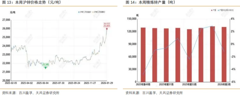 综述:本周(2026.1.23-2026.1.29)锌价表现强势。截止2026年1月29日,0#锌锭现货周均价24914元/吨,较上周同期上涨516元/吨,涨幅为2.11%。近日全球地缘政治不确定性抬升、区域冲突外溢效应加剧,进一步扰动大宗商品市场,美联储1月议息会议维持基准利率不变且未暗示近期重启降息,美元走弱市场风险偏好提升,同时海外能源价格因寒流上涨推高海外冶炼成本,为锌价提供强劲宏观支撑。国内锌精矿加工费低位运行,临近2月春节前期,多家锌冶炼厂存减产安排,导致精炼锌产出预期受限,社会库存节内累增或低于预期,供应偏紧格局凸显;而2026年开年有色金属板块整体景气度攀升、市场情绪持续高涨,板块联动效应下资金做多意愿增强,多重因素共振支撑锌价强势上行。