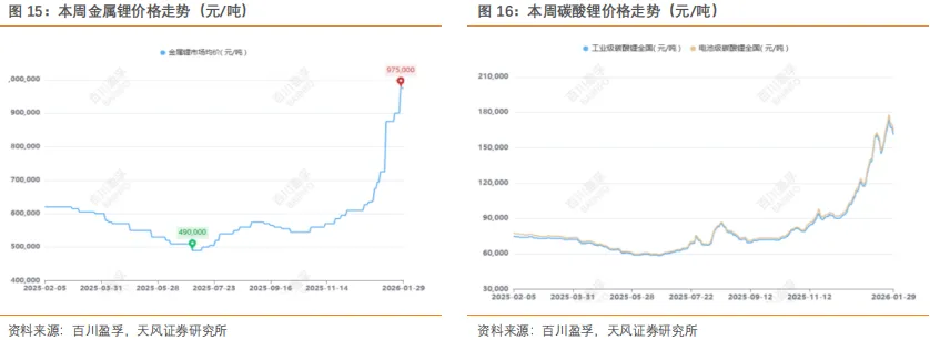 锂:价格宽幅震荡。供应端,春节前部分锂盐厂安排检修,供应预计整体偏弱。需求端,退税政策有望持续刺激市场强出口。本周海外锂矿披露财报,锂高价下部分海外供应释放,Pilbara计划推进复产Ngungaju工厂产能等进一步影响市场情绪。整体来看,供弱需强,去库趋势延续,但市场资金有降温迹象,我们预计锂价短期内仍大幅震荡。
