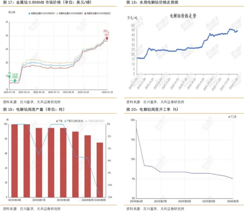 电解钴综述:本周(2026.1.23-2026.1.29)国内电解钴价格窄幅上涨。截至1月29日,百川盈孚统计99.8%电解钴价格在44.1-45.0万元/吨,均价为44.55万元/吨,较上周同期上涨1.3万元/吨,涨幅3.01%。本周MB钴价上涨,国内电子盘震荡整理,本周钴市供应端变化有限,冶炼厂因成本支撑挺价,贸易商延续基差报价。需求端受电解钴价格波动影响,下游企业开工低位,采购积极性低迷,仅维持刚需,市场成交清淡,整体氛围偏弱。