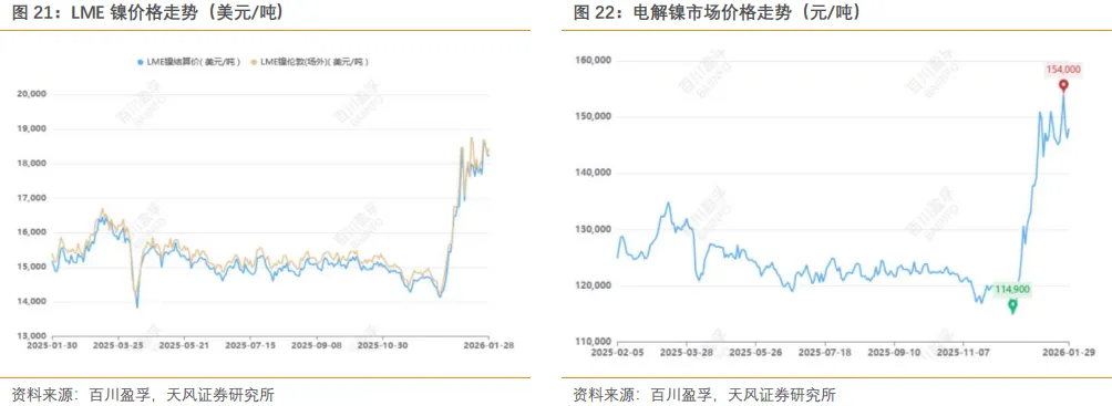 镍:强预期与弱现实拉锯,价格走势震荡。截至1月28日,LME结算价为18200美元/吨,较上周同期环比上涨1.90%,沪镍最高突破15万元/吨。当前镍延续强预期与弱现实博弈的格局,短期主要围绕印尼供应端减产预期与镍市供应过剩的核心矛盾,镍价或维持高位震荡。