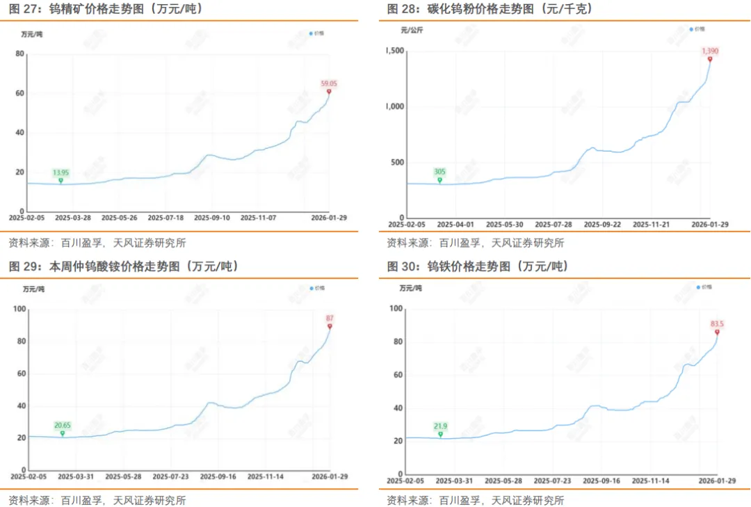 小金属:本周钨价全面上调。截止到1月29日,65度黑钨精矿均价在59.05万元/吨,较上周上调5.8万元/吨,仲钨酸铵在87万元/吨,较上周上调8.5万元/吨,70钨铁均价在81.7万元/吨,较上周上调7.9万元/吨,碳化钨粉在1390元/千克,较上周上调180元/千克。当前全球地缘政治不确定性仍存,钨资源供给约束与战略属性强化,产业链价格继续推高,部分矿山2月初陆续减停产,当前持货商普遍不愿低价放货,场内偶有少量偏高位成交支撑,整体现货交投氛围偏清淡,实际成交多按刚需或执行长协为主。原料端的紧俏态势向冶炼环节充分传导,推动仲钨酸铵企业报价态度坚决,持货商对后市普遍乐观,惜售心态明显,进一步巩固了市场的坚挺走势。钨粉末市场紧跟上游原料涨价步伐,在仲钨酸铵价格上行带来的成本压力传导下,钨粉末产品价格同步走强,但高价下下游企业的备货热情一般,多根据自身生产计划控制采购量。相关标的:锡业股份,兴业银锡,华锡有色。