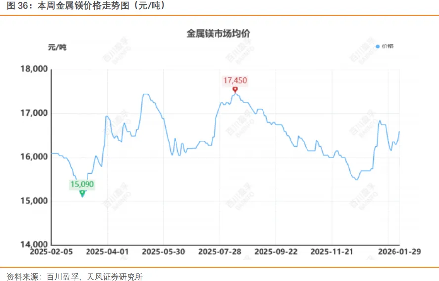 综述:周内(2026.1.23-2026.1.29)金属镁市场弱稳震荡后小幅上涨。周初镁锭市场观望氛围浓厚,由于上周下游逢低采购较多,厂家随即试探上调报价,府谷地区主流出厂含税报价至16300-16400元/吨,但下游接受程度一般,成交跟进放缓,以刚需采购为主。周后期受到下游备货需求支撑,市场信心提振,各镁厂报价持续上涨至16600-16700元/吨,个别头部企业在16700元/吨价位实现成交,场内成交稳步推进。综合来看,近期下游询盘问价增多,厂家稳步出货,供需双方买卖积极性提升,镁锭市场氛围较为活跃,后市还需继续关注下游需求及各工厂开工情况。