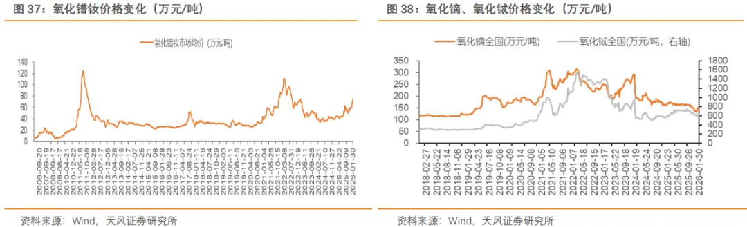 稀土永磁:基本面加速反应,重视权益端催化。当前供给侧受分离端整合影响驱紧,需求侧伴随通用许可证的下放,预期出口将大幅修复,基本面正加速改善。本周价格方面,本周轻稀土氧化镨钕环比+10.9%至74.6万元/吨;中重稀土氧化镝环比-2.1%至140万元/吨,氧化铽环比-2.8%至615万/吨。当前分离厂整合逐步进行,加工费已上行至2万以上,重视中长期分离厂“拔估值”。看长一点,板块大逻辑或将更为清晰,要足够重视上游供给重塑的产业趋势性机会,持续关注板块拔估值持续和基本面修复。