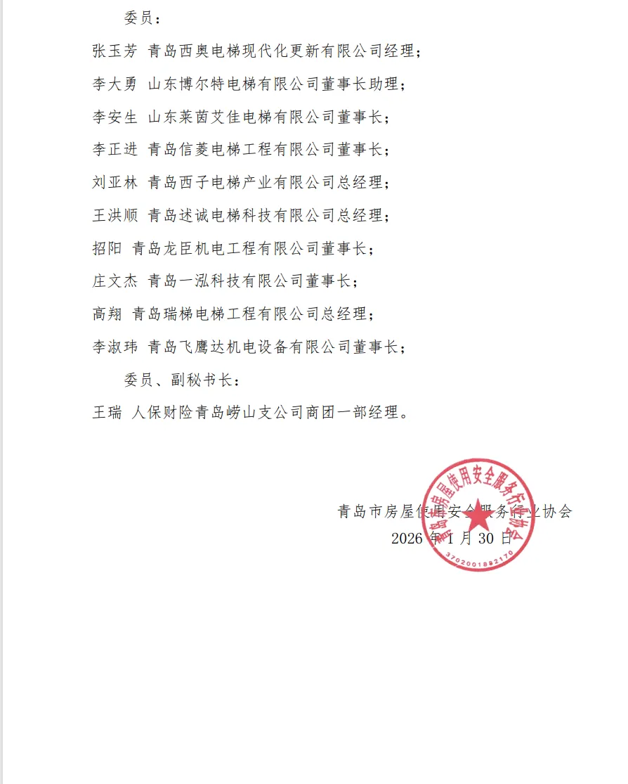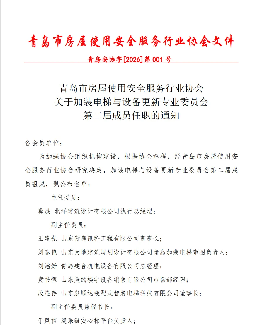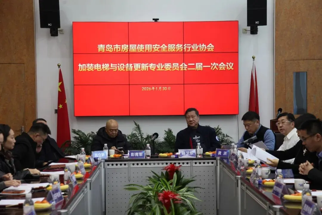 2026年1月30日下午,青岛市房屋使用安全服务行业协会加装电梯与设备更新专业委员会在青岛北洋建筑设计有限公司一楼会议室隆重召开了二届一次工作会议。协会会长杨卫东、顾问彭青军,行业老领导吕立新以及专委会主任委员青岛北洋建筑设计有限公司执行总经理龚洪,副主任委员山东青房讯科工程有限公司总经理王建弘、山东大地建筑规划设计有限公司青岛加装电梯审图负责人青岛宜安建设总经理刘春艳、青岛建合机电设备有限公司总经理刘洺妤、山东美的楼宇设备销售有限公司东芝电梯厂家代表、山东泉顺达装配式智慧电梯科技有限公司代表及专委会部分委员参加了会议。会议由协会副秘书长、专委会副主任兼秘书长、建采链安心梯平台负责人于风雷主持。会议首先做了专委会2025年的工作总结报告,并介绍了国家2026年对加装电梯纳入超长期国债支持的有关政策,同时宣读了加装电梯与设备更新专委会第二届任职成员组成的通知。专委会第二届主任委员青岛北洋建筑设计有限公司执行总经理龚洪致辞讲话;协会顾问委员会顾问、青岛城乡建设集团董事长彭青军致辞讲话;专委会副主任委员山东青房讯科工程有限公司总经理王建弘发言;专委会副主任委员山东大地建筑规划设计有限公司青岛加装电梯审图负责人青岛宜安建设总经理刘春艳发言;专委会副主任委员青岛建合机电设备有限公司总经理刘洺妤发言;专委会副主任委员山东美的楼宇设备销售有限公司东芝电梯厂家代表发言;专委会委员青岛西子电梯产业有限公司总经理刘亚林发言;专委会委员青岛飞鹰达机电设备有限公司董事长李淑玮发言;专委会委员青岛信菱电梯工程有限公司董事长李正进发言;专委会委员青岛西奥电梯现代化更新有限公司经理张玉芳发言;专委会委员山东博尔特电梯有限公司董事长助理李大勇发言;会议中,各副主任委员、委员逐一介绍了各自企业当前的运营情况及在加装电梯与设备更新工作中遇到的具体问题与困难,涉及业主的意见征询、设计图审、检测报告、施工管理、产品质量安全、保险保障、加梯贷款、交付维保、出维保后维护等问题进行了深入而专业的讨论。同时对后续加装电梯的平层入户推广可行性、行业乱象及如何自律等问题进行了探讨。针对这些问题,主任委员龚洪及副主任委员兼秘书长于风雷进行了解答,并提出,会议结束后,各位副主任委员、委员提出的所有问题系统性地汇总至专委会秘书处,进行详尽的分类整理。后续,专委会将梳理制定第二届专委会的工作目标并制定出2026年的工作计划。同时继续肩负起专委会作为政府与企业、企业与企业、企业与金融的桥梁作用,主动与相关的主管部门、相关机构进行沟通交流,持续推进问题的反馈与解决。