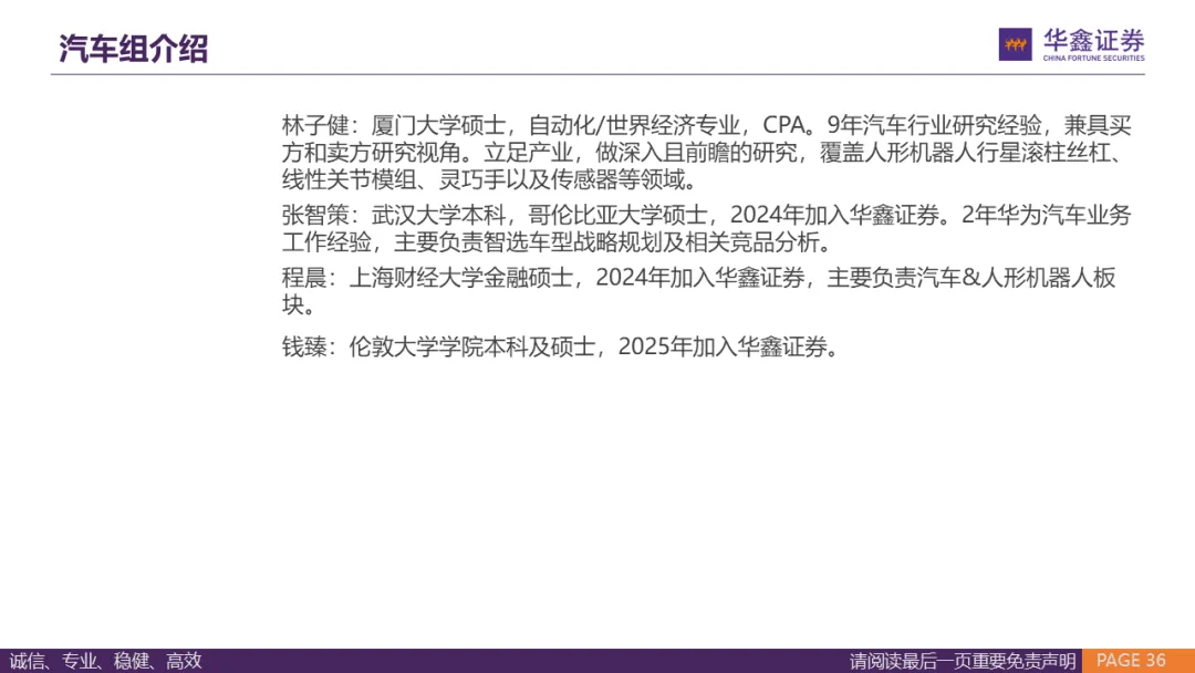 林子健:厦门大学硕士,自动化/世界经济专业,CPA。9年汽车行业研究经验,兼具买方和卖方研究视角。立足产业,做深入且前瞻的研究,覆盖人形机器人行星滚柱丝杠、线性关节模组、灵巧手以及传感器等领域。