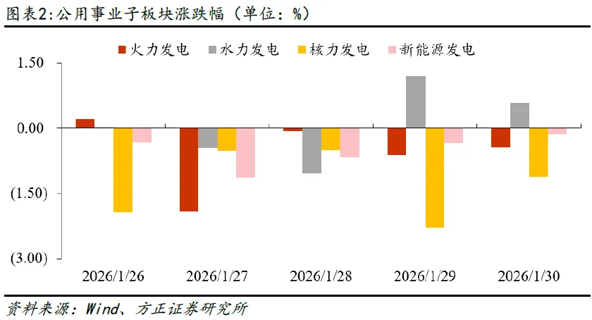 1)火电板块,2026年起各地容量电价普遍提升,我们认为电价端负面影响或在一定程度上有所缓解。建议关注全国化机组布局且稳健盈利的华能国际、华电国际、大唐发电;区域电价坚挺的京能电力;以及新增机组陆续投产有望贡献业绩增量,未来成长性较为清晰的宝新能源、赣能股份。