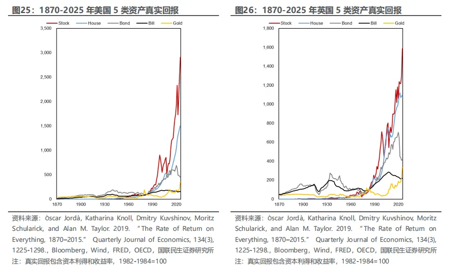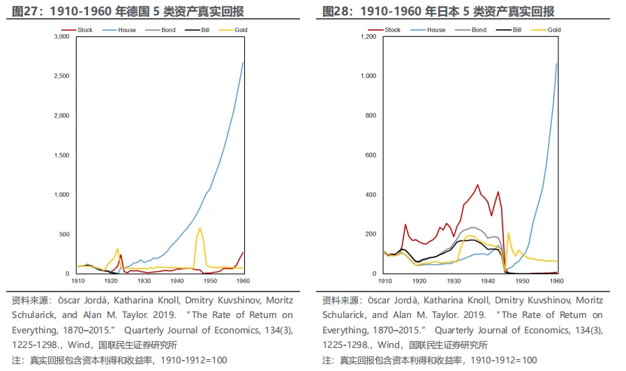 二是黄金在危机时期可能跑赢所有主要资产类别,长期来看其真实回报也高于传统安全资产(债券和票据)。特别是在第一次世界大战和第二次世界大战期间,黄金能够提供避险功能,而其他资产方面,战胜国的股票和房地产、战败国的房地产在战后均表现良好。