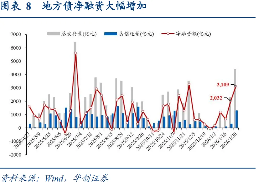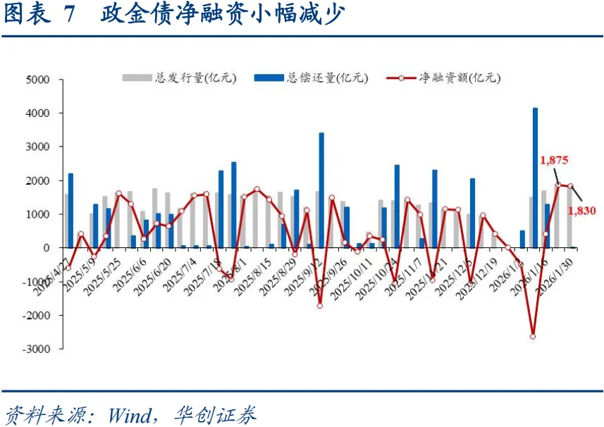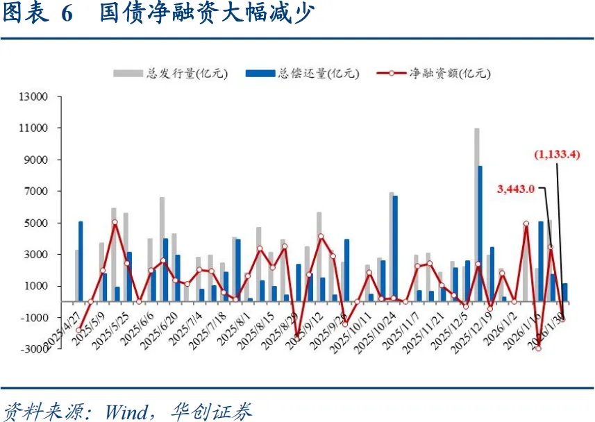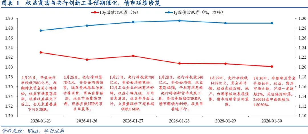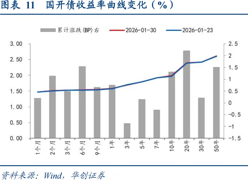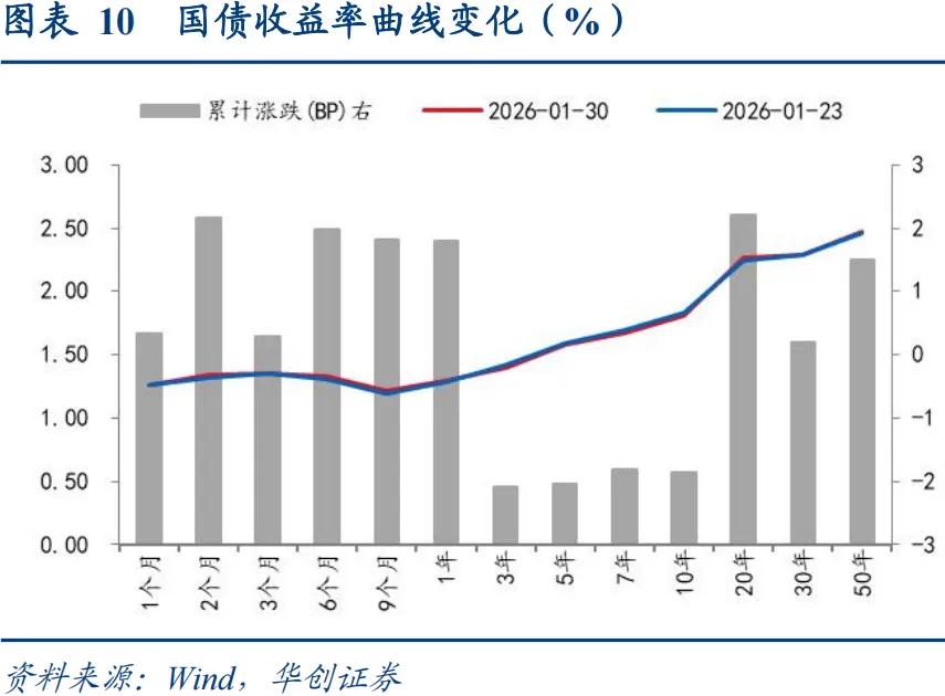 1月最后一周,权益行情受监管降温、外围扰动转为震荡,年初配置行情延续,收益率延续修复。1y国债上行1.5BP至1.29%,10y国债下行2BP至1.8010%,30y国债活跃券收益率上行1.4BP至2.26%。