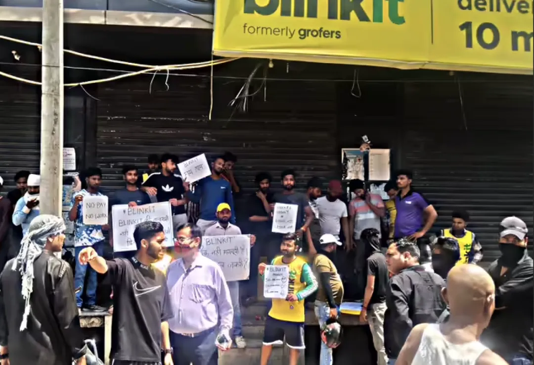 在竞争最激烈的快商诞生初期,递送费有时为零,平台补贴骑手每单约30卢比。四五年过去了,宅急送在印度空前壮大,根据《商业展望》统计,blinkit, zomato等快商分别有3千万活跃用户,日订单处理总和为415-445万订单。请注意,这里的用户其实是以家庭为单位的代表,可以想象快商目前在印度城市中的覆盖率,是非常客观的。奇怪的是,目前的打包和递送费加起来约收客户20卢比,高峰时段增加30卢比,但骑手每单却只能挣到15-25卢比。骑手对《印度斯坦报》的记者吐露了自己的烦恼:自从平台引入了计算机算法,他们这些骑手就被拿捏得死死的。快商骑手被称为“零工工人”(Gigs),也就是保底工资为零的体力劳动者。他们送一单货拿到一份递送费,一天下来如果送30单,除去劳动成本(摩托车汽油或租电动车的费用),能到手的也就是500卢比左右,想要多挣钱必须想办法拿到奖金。奖金的设置是由计算机算法定制的。计算机算法根据天气因素、下单数量、高峰时间段、节日因素、骑手上工率等等因素,每天调整能够拿到奖金的订单完成数量,其实底层逻辑就是:想要挣到奖金,就必须完成超常规数量的订单,而快跑+超时工作就是骑手唯一的多挣钱的途径。零工工人圣诞罢工。图源:economictimes.indiatimes.com