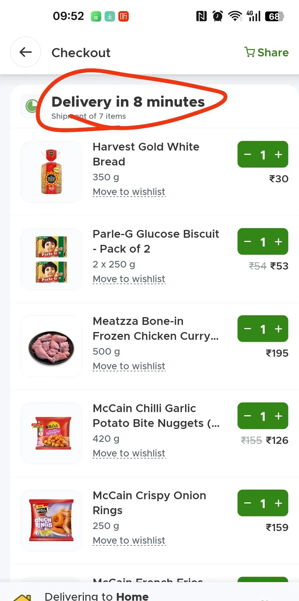 在印度道路交通混乱拥挤的环境中,加之多数地区夜间照明不足,“快跑”造成了频发的交通事故,引起了社会的重视。特别是骑手们在圣诞和新年夜的罢工,让印度社会把关注的目光转向骑手群体的安全和利益。印度政府目前要求平台取消“10分钟送达”服务,在社会各界引起了极大的正面反响。谁曾想,反应最消极的竟然是骑手,他们对《印度斯坦时报》的记者反应,取消“10分钟”送达不会有什么用,因为跑得慢了不但不能完成得奖金的单数,还会影响顾客的体验从而拿不到小费。为了验证政策是否影响得到实际操作,笔者在政府发布“取消十分钟许诺”之后,再次下单时候特意记录了一下。Blinkit在下单页面仍然标明“8分钟送达”。结果是打包2分钟,路程4分钟,上楼2分钟,一共8分钟送到家!笔者花费了12卢比递送费,9卢比打包费,外加小费20卢比,一共合计人民币3块多(当然也可以不给小费,省下一半的费用)。实操检验。图源:“印度通”微信公众号