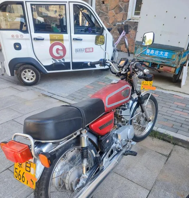 这个红黑配的老车叫雅马哈街车,钢丝轮圈亮得刺眼,长长的镀铬排气管直通到尾,一拧油门那阵嗷嗷的二次震动,把人从巷口惊到街口,小时候我爱趴在后座看师傅换机油,黑乎乎的油流下来像酱,师傅叼着烟说别学我,小孩儿远点,别烫着,现在看见这造型还觉得顺眼,简简单单两条线把力量勾出来了.