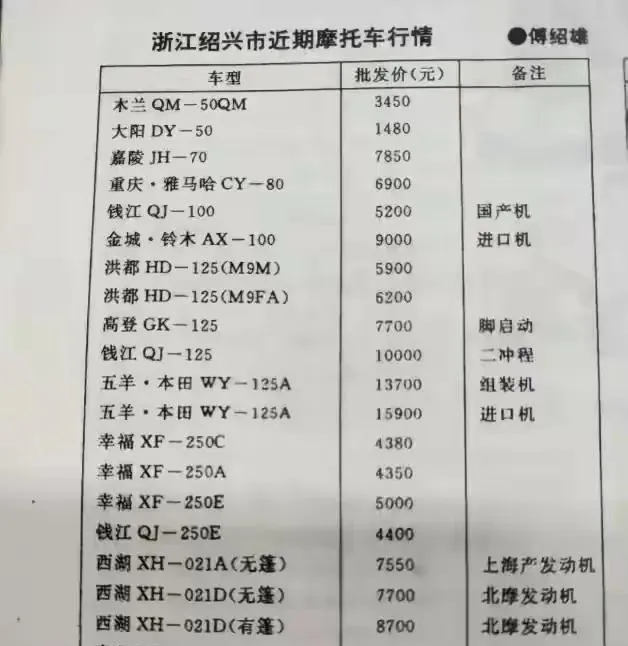 图里这张就是当年绍兴一带的摩托行情单,嘉陵JH70写着7850,重庆雅马哈CY80标6900,金城铃木AX100备注进口机,批发价9000,看着冷冰冰,背后都是热腾腾的工资本,爸爸说过一句实在话,买车不是选颜色,是算命一样掂量几年饭钱,现在咱打开手机就能比价,过去得骑着自行车去城里问一圈,问完心里只剩一句,先回去再攒吧.
