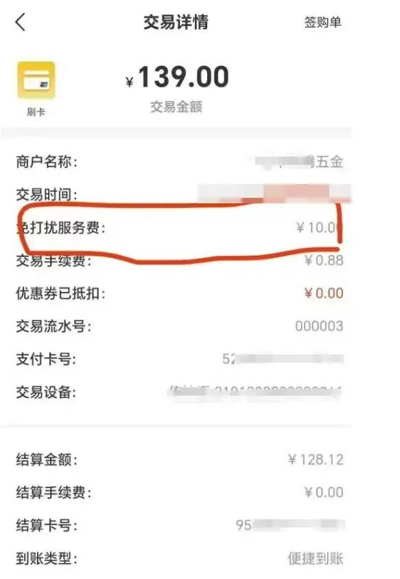做支付,有人靠直营赚钱,激活一台POS机,赚激活奖,赚流量费,赚交易分润......还有的靠招商赚钱,大量招小代理商,开始利润很低,但是积少成多,交易量起来了赚的就多了......当然,还有靠收割韭菜来赚钱的,动动小心思,搞搞这搞搞那,钱就库库往小口袋里进了。近日,有代理商曝料支付行业内又开创了一项新的收费项目“免打扰服务费”!用户21点5分交易金额139元,莫名被多扣了10元,一看原来是一种名为"免打扰服务费"的项目。反正他就是多了这一个收费项目,至于到底免打扰了什么就等着收费方给个解释吧。多家支付公司现在能收费的项目都已经公示了出来,这个“免打扰服务费”收取的合不合理还不好说。这些年支付行业已经研发出了不少收费项目,什么流量费啊、各种服务费啊、保险费、会员费、秒到费、管理费等等。有不少大哥就是靠着这些费用买车买房,开豪车住别墅。“支付行业只要不要脸,就能赚的盆满钵满”。这句话的含金量还在上升,曾经的承诺和保证在收割的那一刻就当是在放屁了。一般开始收取各种服务费的平台,是不会满足于只收取一次/项费用的,后续很有可能再次上调费率信息,或者增加新的收费项目,对于用户来讲,能换掉的就抓紧时间把机器换掉吧,这钱出的实在是太亏了!另:支付行业瞬息万变,内容每天不够发请关注:支付江湖,我们将继续为您报道行业最新资讯,一起为支付行业添砖加瓦!