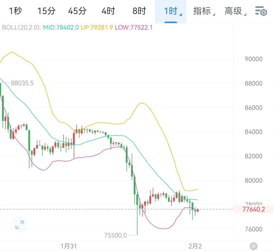 从技术结构综合观察,市场已跌破短期多头中枢并形成依次降低的高点与低点,周线级别动能指标如MACD与RSI均转向走弱,显示空头趋势具备较强延续性。BTC下方短线支撑可重点关注75000-76000结构区间,若失守则可能进一步下探70000心理关口。