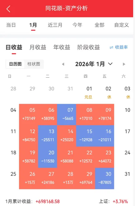 这波行情最魔幻的地方,在于“政策与市场的灵魂对话”。月初高层强调“稳字当头,巩固稳中向好势头”,市场表面回应“收到”,实则用高开低走的操作翻译:“稳过了头,有点上头”。监管层怕市场大起大落,结果市场直接选择性执行“防止大起”,AI应用、商业航天板块上半月连续大涨,下半月用连续跌停诠释“不涨就是稳”;有股民精准吐槽:“现在的行情,稳的是指数,乱的是人心;紧的是监管,松的是钱包;热的是白银,冷的是我的持仓”。个人1月凭借中金黄金和网宿,取得魔幻开局!