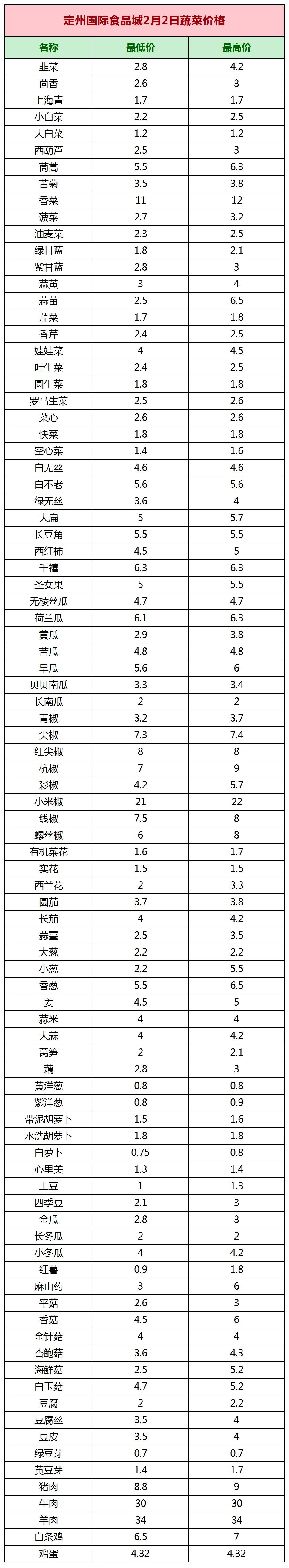 【民以食为天,365天,天天无淡季。为方便广大商户进货采买,获取最新蔬果信息,此微信号每日为您提供定州国际食品城蔬果行情。以下果蔬价格数据计量单位均为元/斤!果蔬价格行情波动比较频繁,请以实际购买单价为准!】