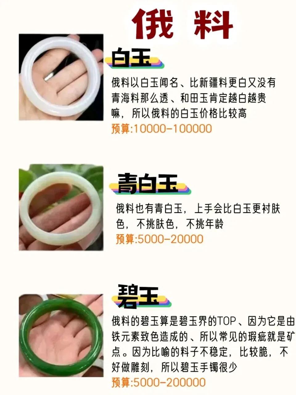 碧玉: 绿色系和田玉,色泽多样,深受喜爱,是入门和日常佩戴的好选择。著名产地有新疆和俄罗斯,新疆玛纳斯碧玉和俄罗斯7号矿碧玉在市场受欢迎度最高。