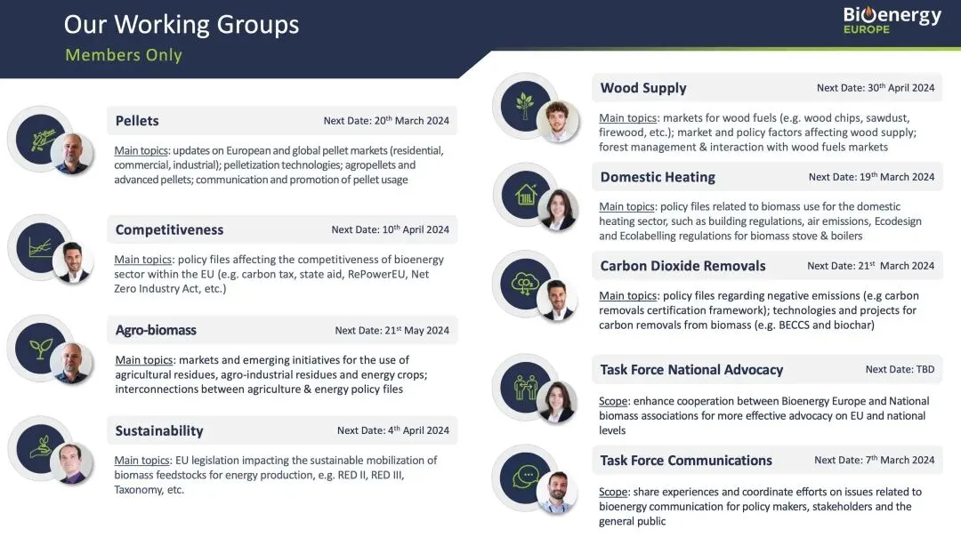协会的工作组主题包括:木材供应、颗粒燃料、农业生物质、可持续、竞争力、碳移除(BECCS/生物炭)、传播沟通等。