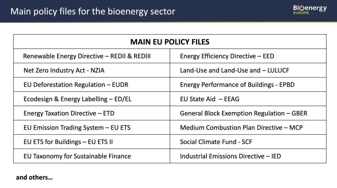 一长串欧盟政策文件:可再生能源指令(RED II/III)、EU ETS碳交易、工业排放指令(IED)、零毁林法规(EUDR)、土地利用与林业(LULUCF)、可持续金融分类法(Taxonomy)等。