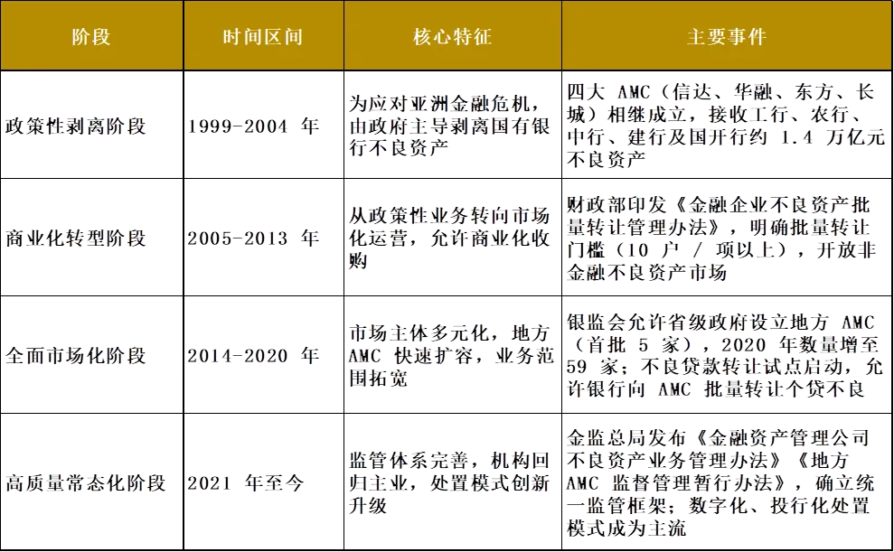 中国不良资产处置行业的演进,大致经历四个关键阶段,每个阶段的监管框架与市场特征差异显著: