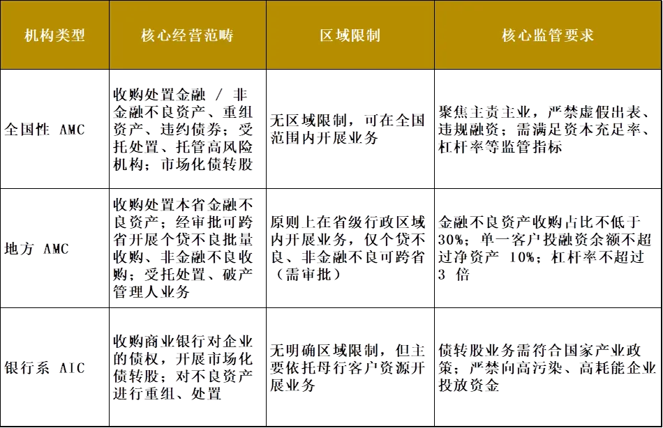 - 全国性金融资产管理公司(五大 AMC)包括信达、东方、长城、中信金融资产(原华融)、银河资产,为中央金融企业,是防范化解重大金融风险的 “国家队”。