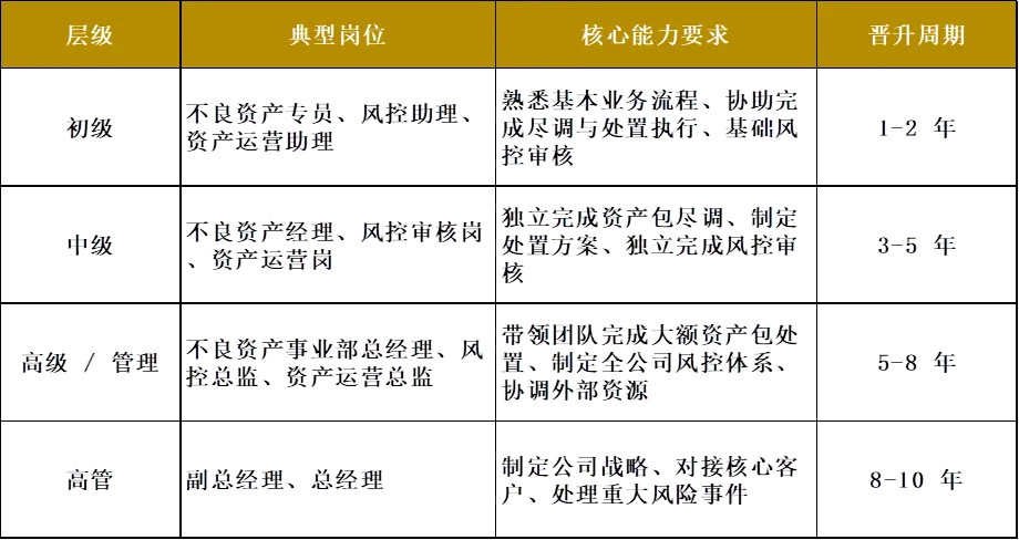 - 业务线不良资产专员 → 不良资产经理 → 不良资产事业部总经理 → 副总经理 / 总经理;