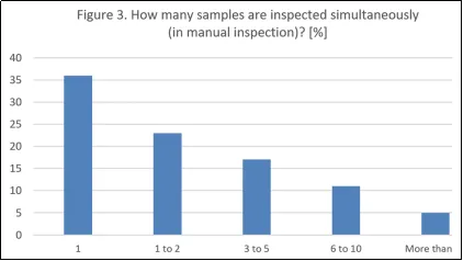 当被问及同时检查多少个药品单元时,超过半数的受访者(59%)表示他们允许同时检查1至2个单元,这也符合良好实践。然而,药典对可同时检查的样本数量没有限制。AQL数据可用于证明同时检查两个以上样本的合理性。同时检查多个容器的优势在于容易发现过量或不足的情况。