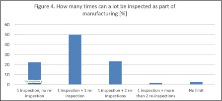 大多数公司还对作为生产流程一部分的每批产品的目视检查次数设定了明确的限制。对于“在生产过程中,一批产品可以进行多少次100%检查?”这一问题,22%的公司只允许进行一次检查且不允许复检,50%的公司允许一次复检,23%的公司允许两次复检,2%的公司允许两次以上复检,3%的公司表示没有明确的限制。这些数据非常有趣。不允许任何复检(22%)的规定非常严格。73%的公司允许在生产过程中进行一次或两次复检,这与现行法规(FDA倾向于只允许一次复检)相符。然而,5%的公司允许进行两次以上复检或对100%目视检查的次数没有限制。这可能会通过将目视检查描述为纯粹的生产步骤而非测试来加以辩解。然而,如果复检次数经常很高,那么在GMP检查中可能需要对先前生产流程的有效性作出解释。
