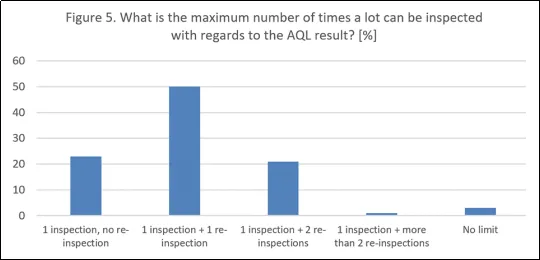 大多数公司(50%)允许在AQL检验不合格后对一批产品进行一次复检,21%的公司允许进行两次复检,而一小部分(3%)公司表示没有明确的限制。这种无限制的复检做法存在合规风险,因为附录1要求对异常缺陷水平进行调查和趋势分析,而USP仅在经过验证和控制的条件下才允许进行第二次检验。新的ECA指南 5.0 提出了一种在AQL检验中发现颗粒时应遵循的程序,建议只有在完成书面根本原因分析、采取纠正措施并收紧AQL接收标准后,才进行第二次100%检验。