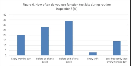 在常规检查中使用功能测试套件这一做法也体现了成熟的操作规范:34%的受访者会在每批产品生产前后进行测试,28%的受访者会在生产前后进行测试,还有20%的受访者会在每个工作日进行测试。这些结果符合附录1(8.32)的要求,该附件要求在系统启动前以及定期对自动化系统进行验证测试。它们也与USP和ECA 5.0中的建议相一致,这两份文件都强调了对自动化检测设备进行持续性能验证的重要性。