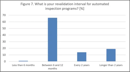 还询问了自动化视觉检测(AVI)系统再验证的频率。结果显示,大多数公司会在6至12个月内进行重新验证(占66%),这相当于1个年度周期,与当前的监管要求高度一致。仅有1%的公司报告重新验证周期少于6个月,这种情况通常出现在流程或其他方面发生变化需要提前审查的情况下。一小部分公司每2年进行一次重新验证(占14%),而19%的公司表示周期超过2年。因此,这项调查表明,三分之二的公司遵循每年或更短周期的重新验证频率。