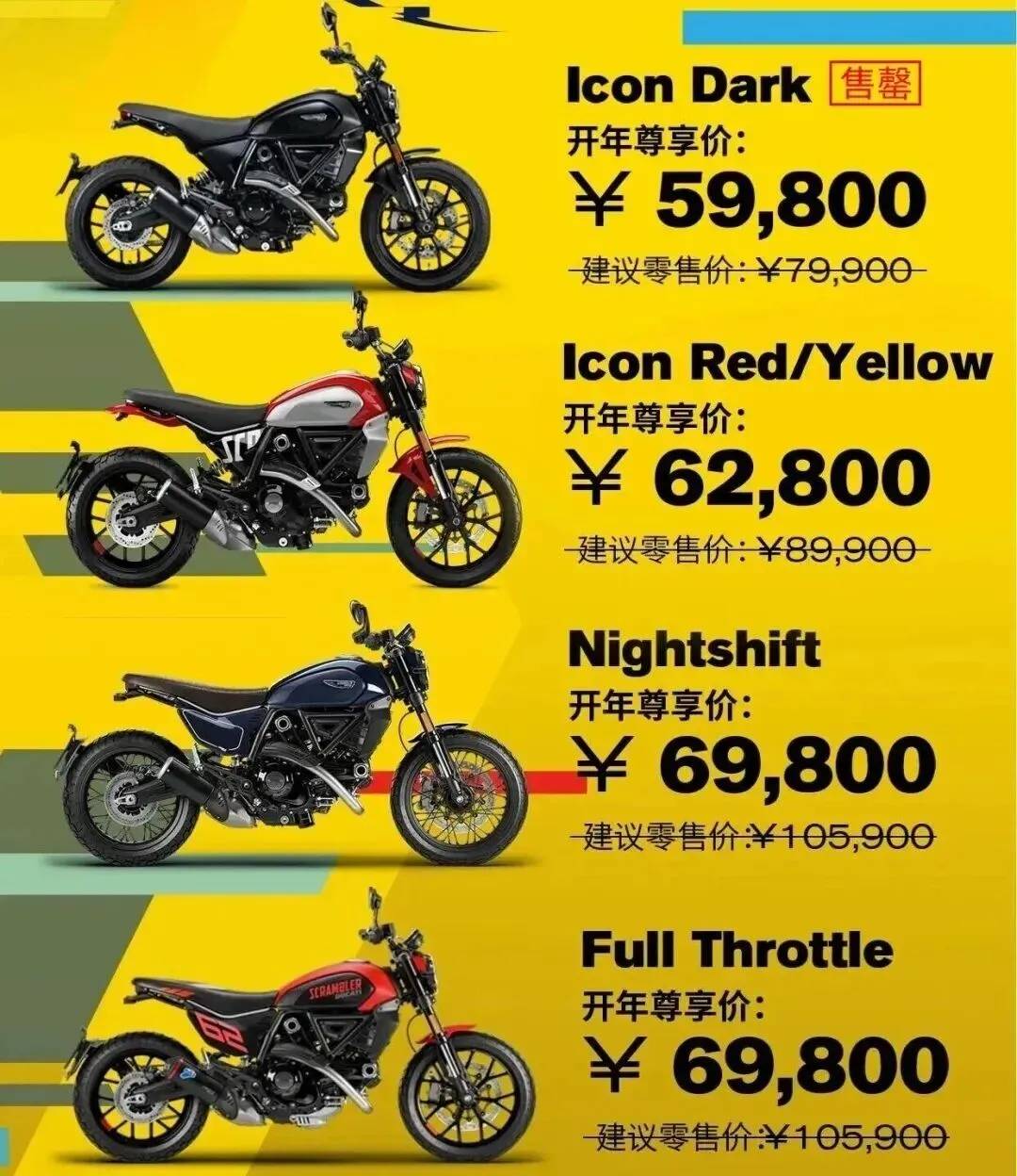 先说说这价格吧,说实话,有点狠。Icon Dark直接干到五万九千八,虽然手慢无,但这信号够明确了,杜卡迪的复古门槛,这回是真“哐当”一声砸下来了。其他几个版本,像Icon红黄、Nightshift、Full Throttle,也都是一刀下去三万多没了。我琢磨着,那些之前二手市场挂三四万的车主们,这会儿心情可能有点复杂。但反过来想,对于一直眼馋这车又觉得高攀不起的兄弟,现在这机会,简直是捡漏窗口期啊。