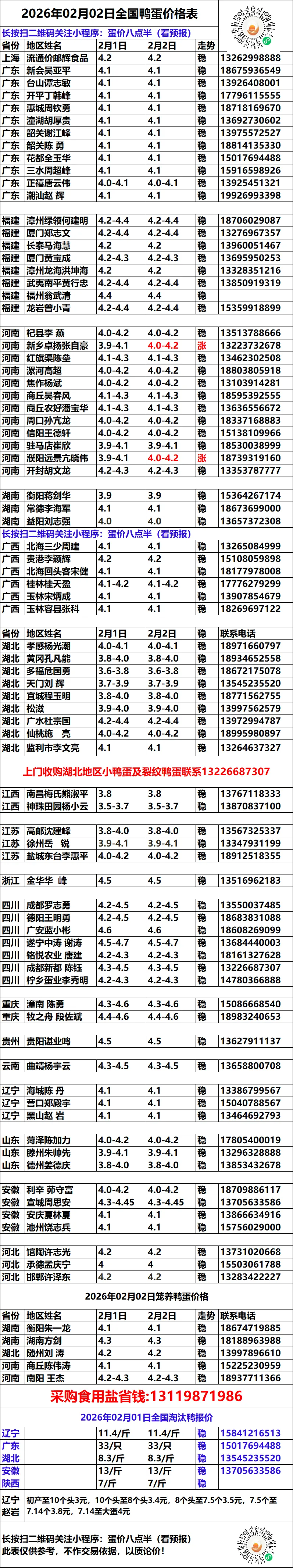 亲爱的读者朋友: 您所看到的《全国鸭蛋价格天天报》数据,并非来自官方统计,而是由一线采购员、养殖合作社代表和鸭蛋生产厂家自发组成的行业联盟共同采集汇总。