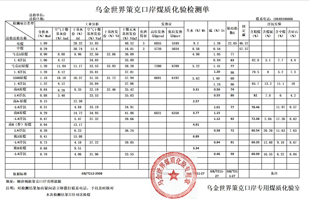 乌金世界策克口岸全煤种系列指标,包含蒙古马克西原煤、蒙古马克A原煤、蒙古马克A2原煤、蒙古马克F5500原煤、蒙古南戈壁A原煤、蒙古南戈壁B原煤、蒙古南戈壁A-原煤、蒙古欧斯克A原煤、蒙古欧斯克B原煤等,具体指标见下图: