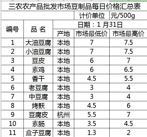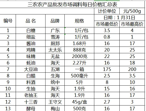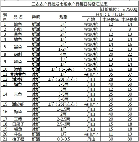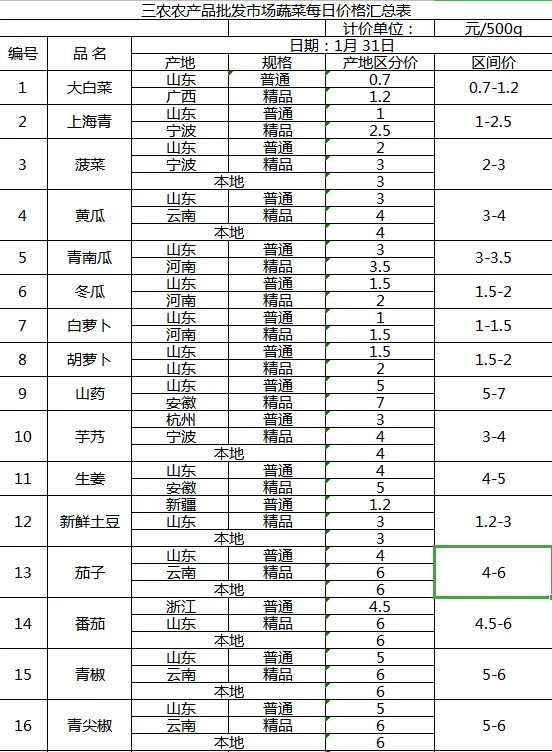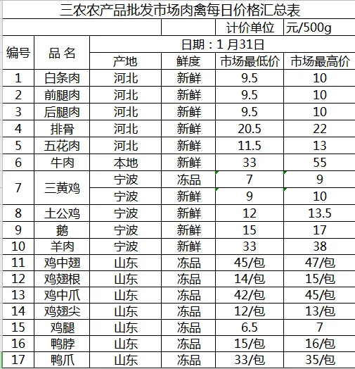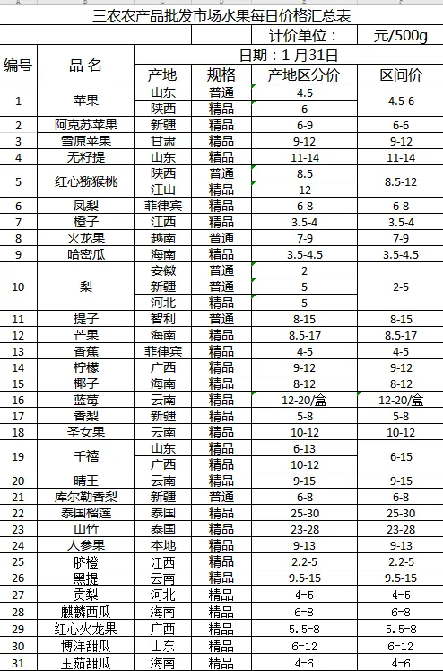 >三农农产品批发市场每日生鲜价格指数公布(1月31日)