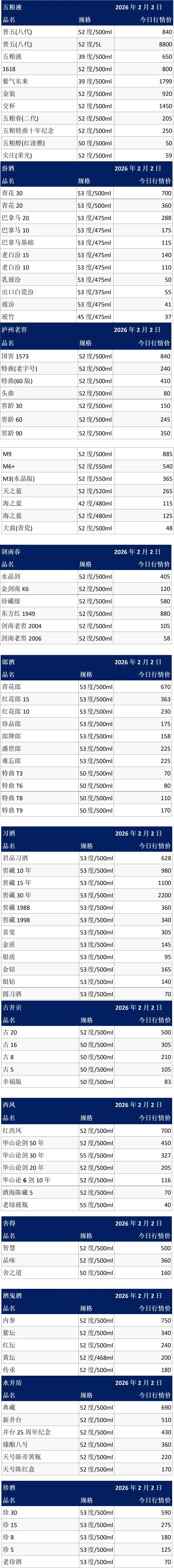白酒价格:2月2日茅台价格!各大名酒批发行情参考价!