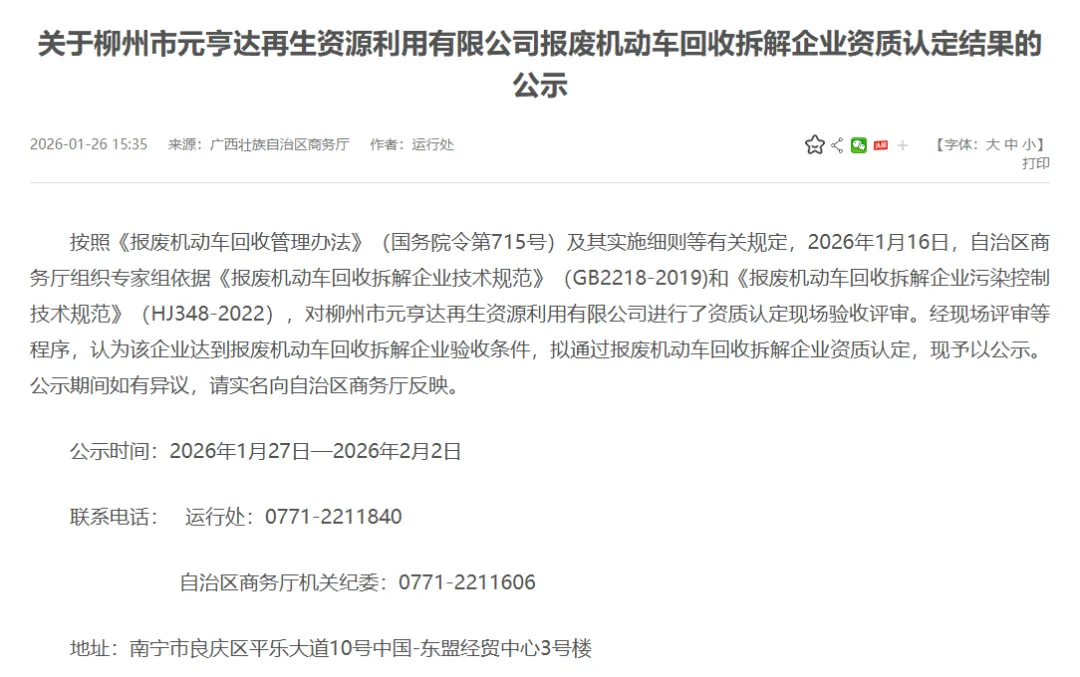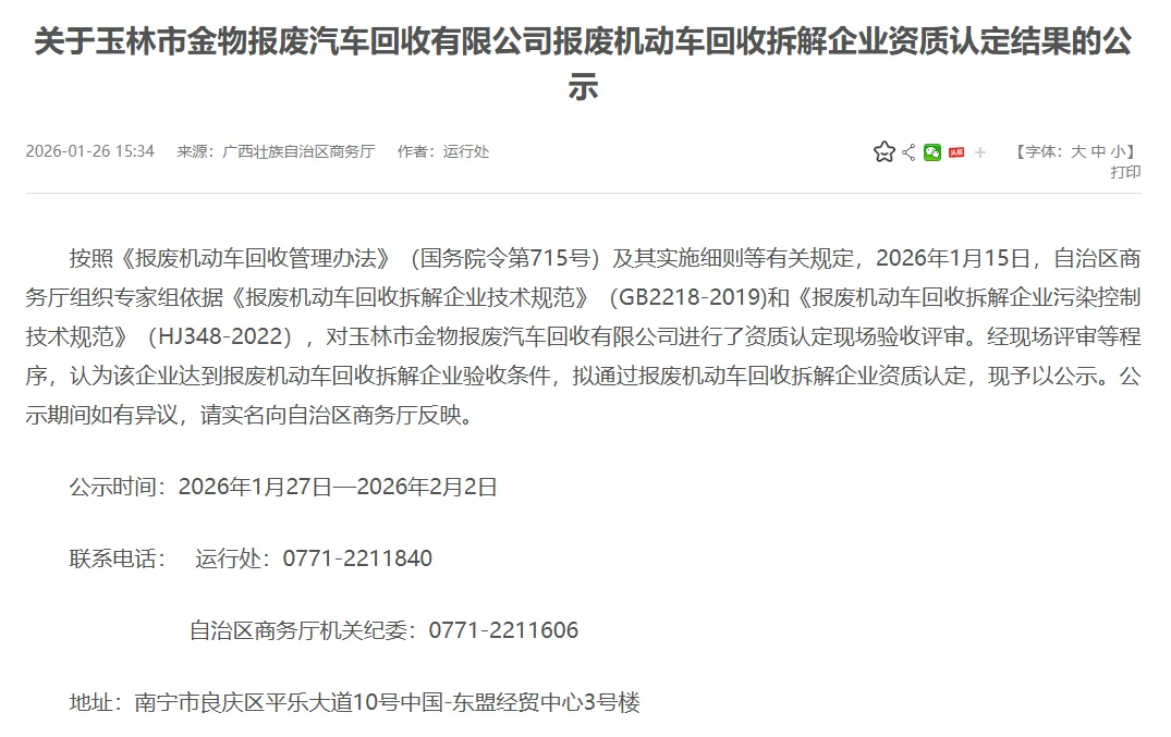 2026年1月26日,广西商务厅发布关于玉林市金物报废汽车回收有限公司报废机动车回收拆解企业资质认定结果的公示