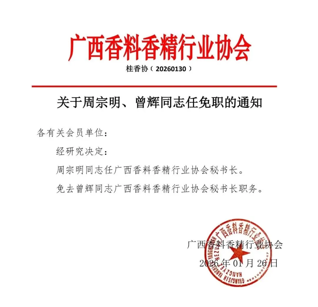 2026年1月30日,广西香料香精行业协会新任秘书长聘任仪式圆满举办,协会轮值会长杨志民董事长为周宗明同志颁发聘任书,正式聘任其担任协会秘书长一职。