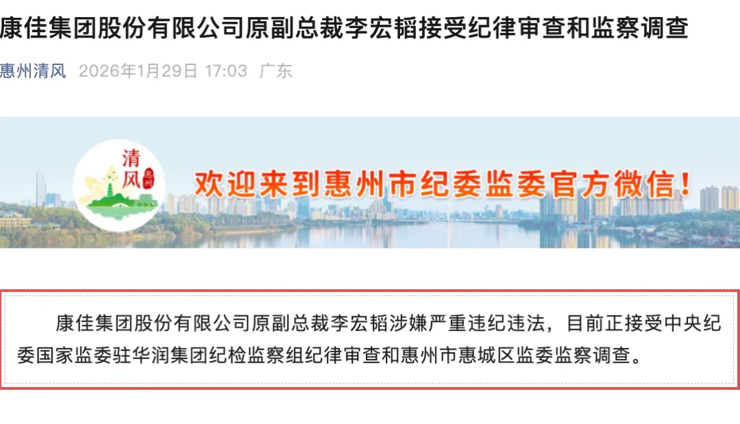 1月29日,惠州清风(惠州市纪委市监察委官方发布平台)发文通报,康佳集团股份有限公司原党委书记、董事局副主席周彬,以及康佳集团股份有限公司原副总裁李宏韬,均因涉嫌严重违纪违法,目前正接受中央纪委国家监委驻华润集团纪检监察组纪律审查和惠州市惠城区监委监察调查。