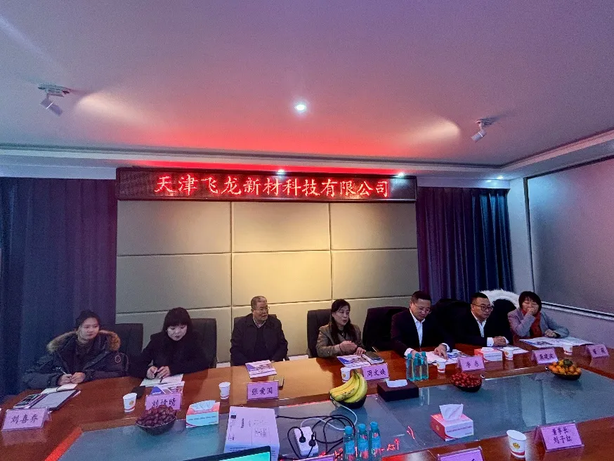 1月26日下午,天津市对外经济合作协会会长周文焕、首席专家张爱国、中建六局国际公司总经理李东一行率队莅临我公司考察指导工作。在市合作交流办原副主任焦勇的引荐下,飞龙集团董事长刘子红、飞龙新材总经理刘子香及管理层核心成员热情接待各位嘉宾。