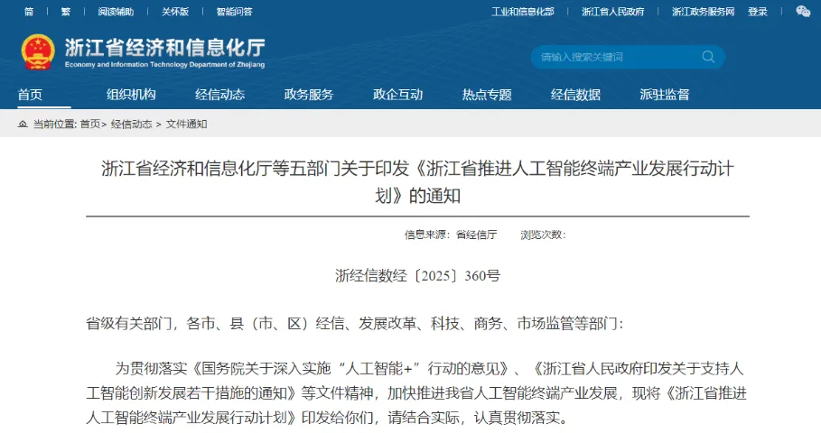 为贯彻落实《国务院关于深入实施“人工智能+”行动的意见》、《浙江省人民政府印发关于支持人工智能创新发展若干措施的通知》等文件精神,加快推进浙江省人工智能终端产业发展,浙江省经济和信息化厅等五部门联合制定《浙江省推进人工智能终端产业发展行动计划》(以下简称《计划》)并于近日印发。