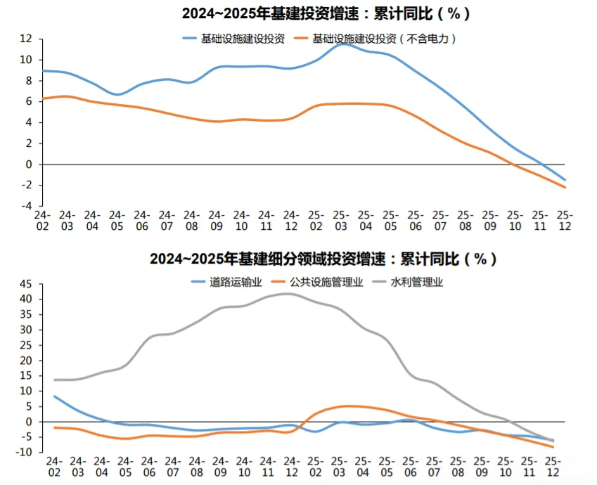 整体投资增速下行: 2025 年基础设施投资(不含电力)同比下降 2.2%,降幅较前 11 个月有所扩大,整体呈现微降承压态势。