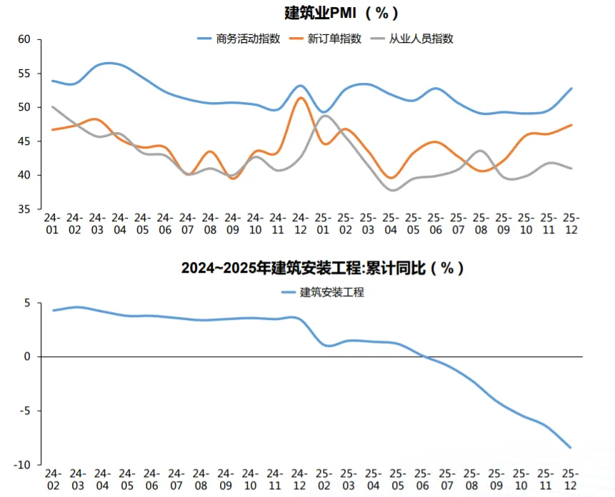 2025 年建安投资同比下降 8.4%,下半年降幅显著扩大。房地产建安投资持续低迷拖累整体,基建领域虽有专项债、超长期特别国债资金支撑,但化债导致资金挤占、新建优质项目缺口等问题,使得实物工作量转化不足,未能对冲下行压力。。