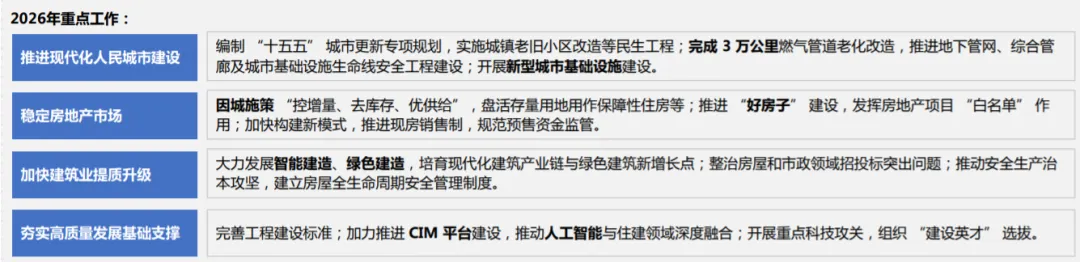 内容总结:2026 年作为 “十五五” 开局之年,住建系统围绕“高质量发展” 核心目标,明确四大重点任务。