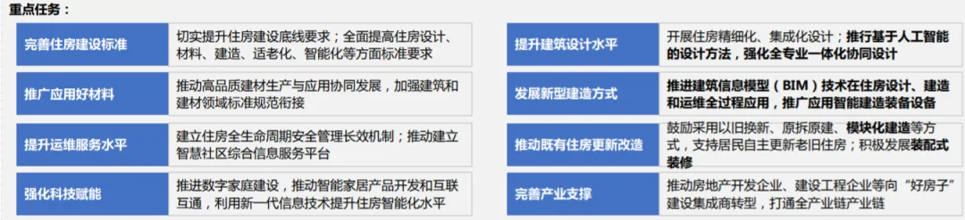 对建筑企业:推动房地产开发、建设工程企业向 “好房子” 建设集成商转型,打通研发、设计、生产、施工等全产业链,培育行业新质生产力,带动建材、家居等上下游产业链协同升级。