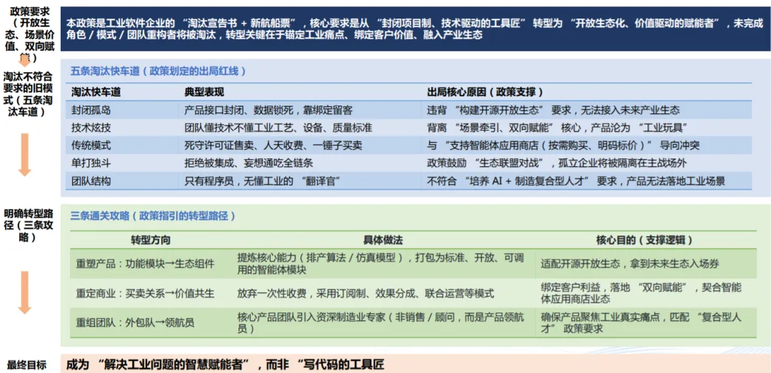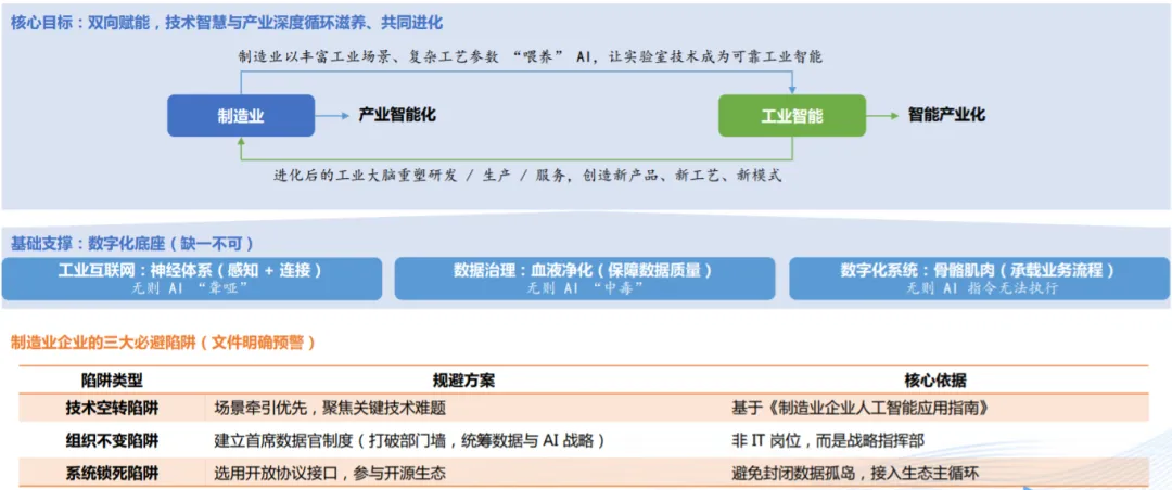 政策本质:本 “AI + 制造” 专项行动政策,是引导制造业从 “工具革命” 迈入 “智力革命” 的清晰路线图,以 “双向赋能” 为核心逻辑,要求相关主体快速筑牢数字化底座、规避转型陷阱,聚焦并抢抓窄窗口发展机遇,以基础体制对智慧能力的承接效率为核心竞争维度,推动制造业实现新智生产力突破。